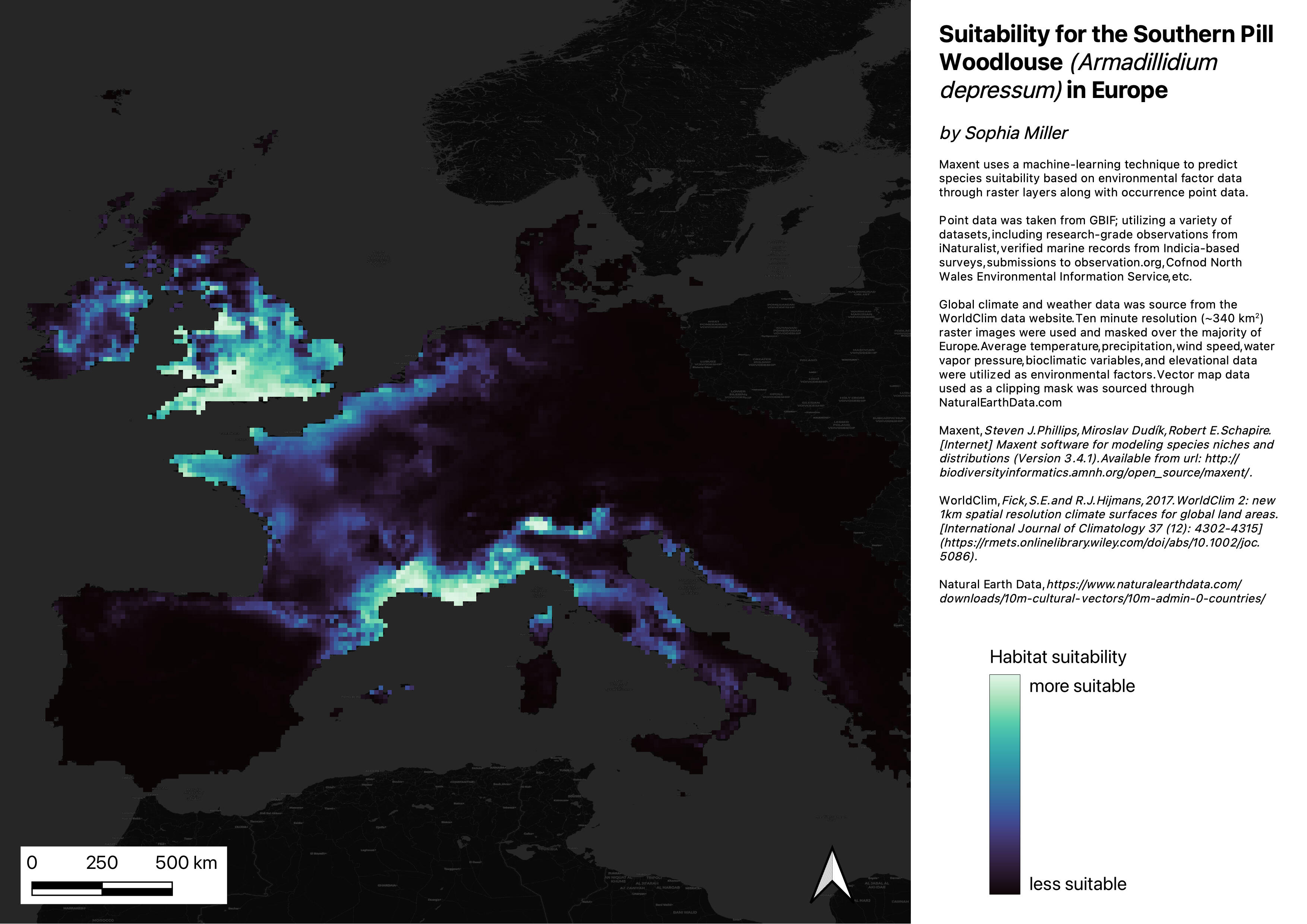 Suitability map for the Southern Pill Woodlouse - utilizing Maxent and WorldClim environmental data. Made in QGIS